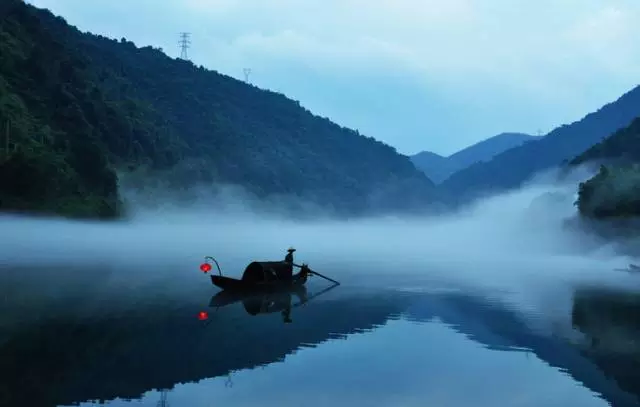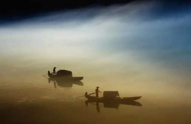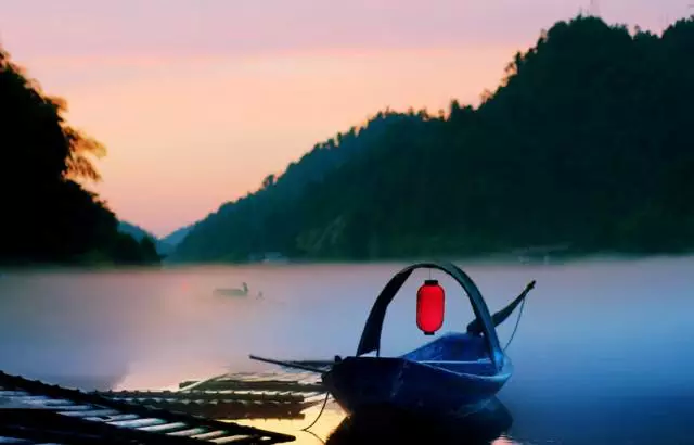 阳光还没升起来的时候,远处的山和树木都是灰黑一片,白白的江雾上,几位船家划着乌篷船挂着红灯笼镶嵌此中,仿佛一幅诗意的水墨画,而主题是典型的中国版渔歌颂晨。