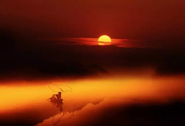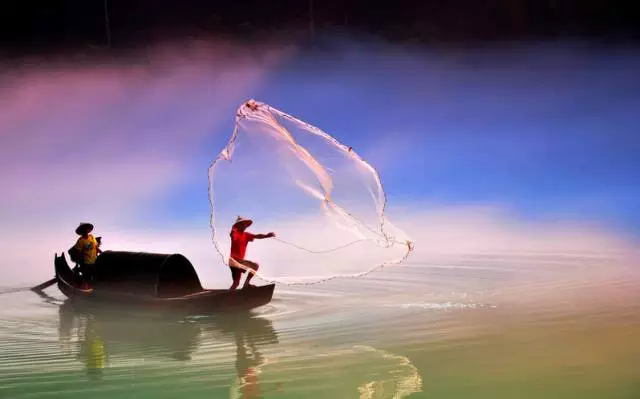 彩霞下撒网,犹如天上人间。