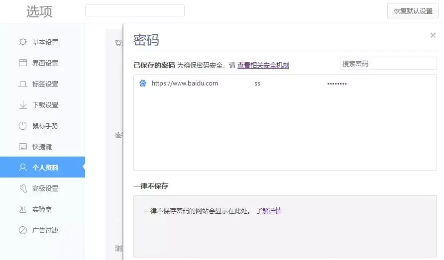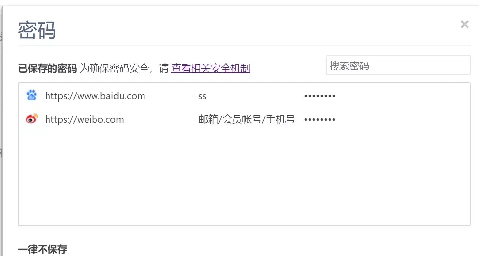 这时我还发现,不但没有导出,连显示密码都没有,这不科学啊,都是chrome内核的浏览器,你怎么这样优秀!?
