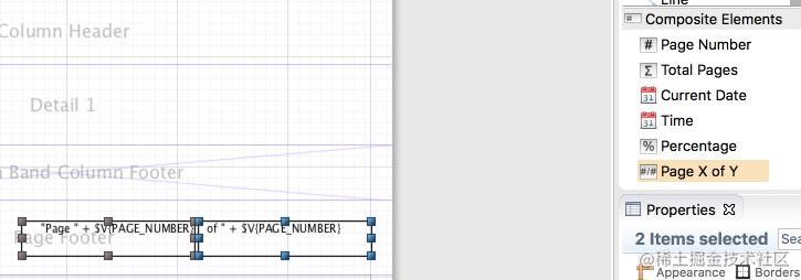 这个内置的组件是通过两个 Text Field 实现的,如果对对齐的精度要求不高,直接使用这个组件也是挺方便的。其原理就是使用了两次 $V{PAGE_NUMBER} 变量,只是设置不同的求值时机即可。对于每一页的页码设置 Evaluation Time 为 Now,对于总页码设置为 Report。