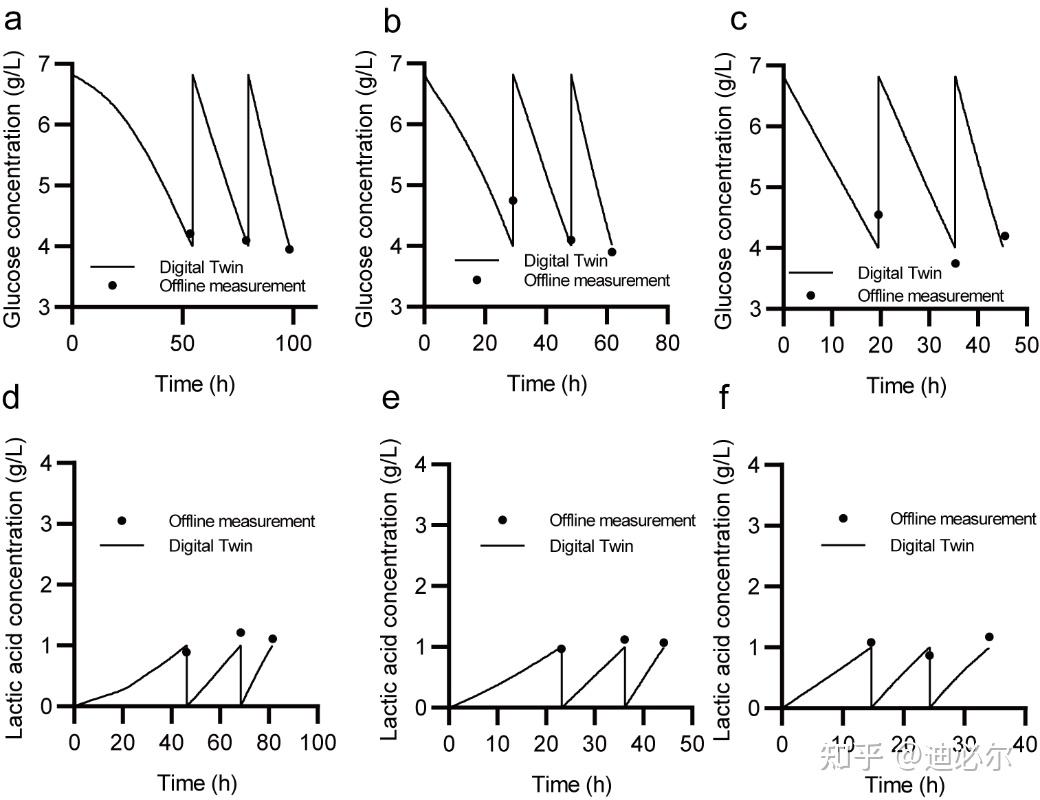 如果只有离线测量数据可用,由于更新周期较长,即使数字映射周期性地进行了校正,误差也会随着时间的推移扩大(图7(g))。数字孪生基于传感器数据更新了μmax,从而跟踪了细胞生理活性和比生长速率的变化(图7(d)),获得了更加准确的预测结果。