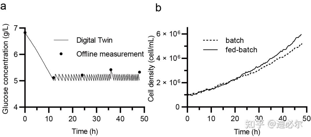 如图6所示,为了验证模型预测的准确度和控制效果的稳定性,每隔12h进行一次葡萄糖离线取样测量,结果表明,基于数字孪生的模型预测控制可以将葡萄糖浓度稳定地维持在5g/L。此外,与批次培养相比,在48 h的培养后,该策略使细胞得率提高了14.8%。