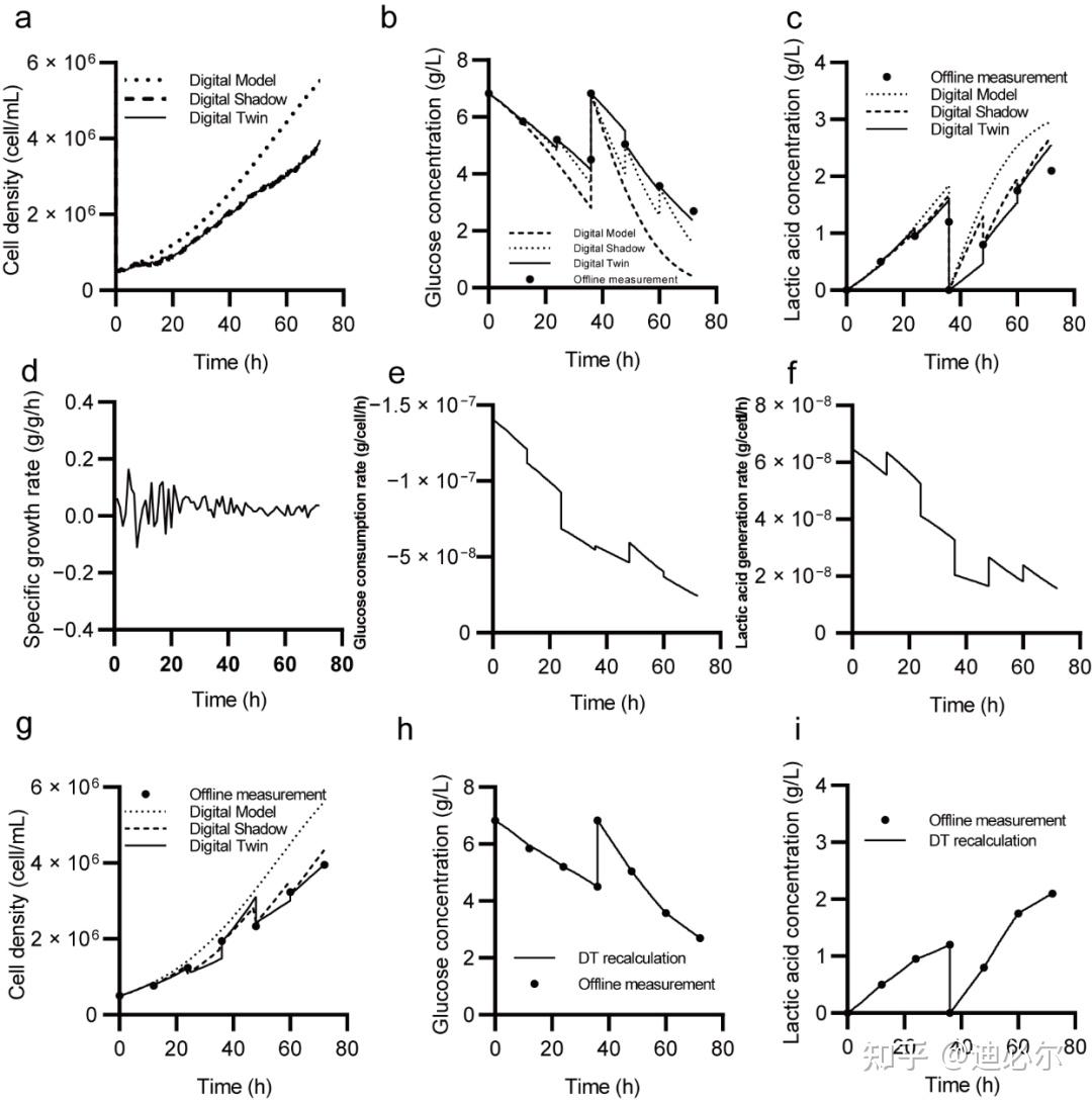 图7(h)(i)展示了通过利用数字孪生获得的更新参数重新计算历史的细胞密度、葡萄糖浓度和乳酸浓度的过程趋势。由于离线数据仅反映了时间上离散的培养过程。通过重建整个培养过程,数字孪生使研究人员能够更全面地研究历史过程的条件,从而获得对所研究的生物系统更详细和准确的理解。