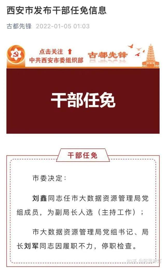 1月5日凌晨,西安市委组织部宣布, 西安大数据资源管理局党组书记、局长刘军因履职不力,被停职检查。