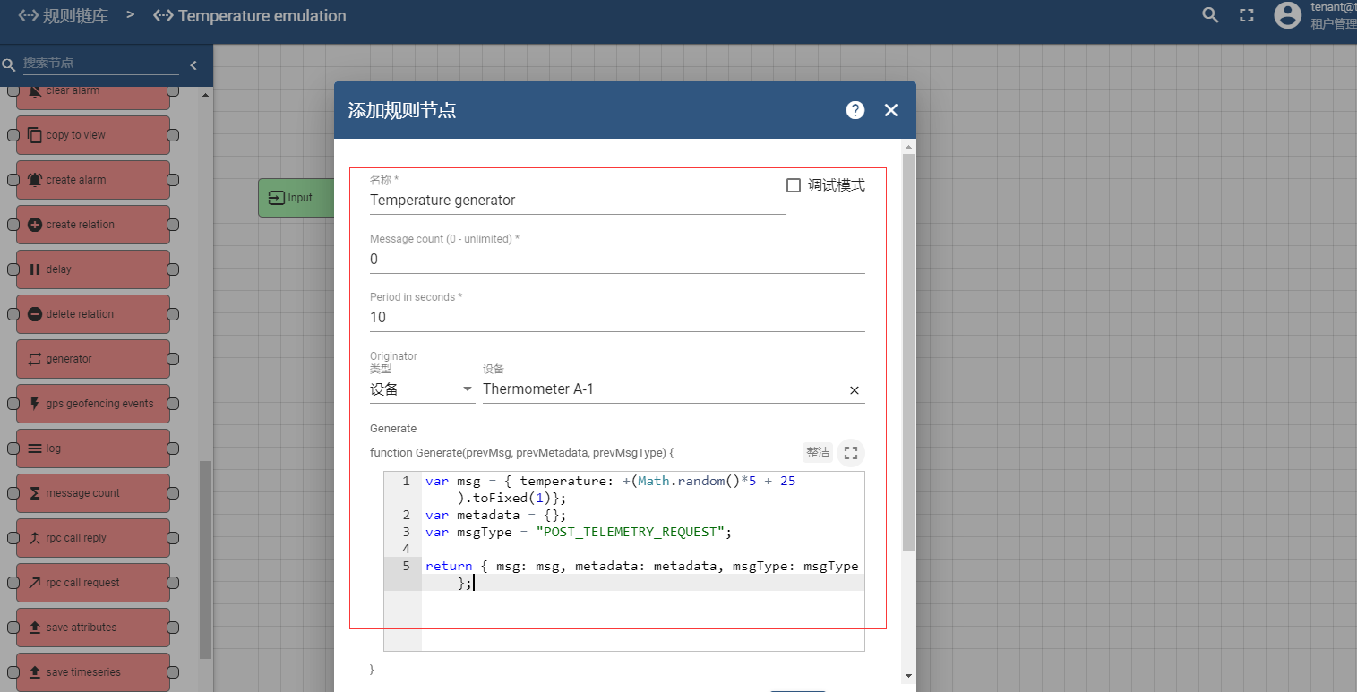 添加完成后,单击 Open rule chain 打开 Temperature emulation 规则,进入编辑页面,添加 generator 节点,填写相关属性值如下所示;