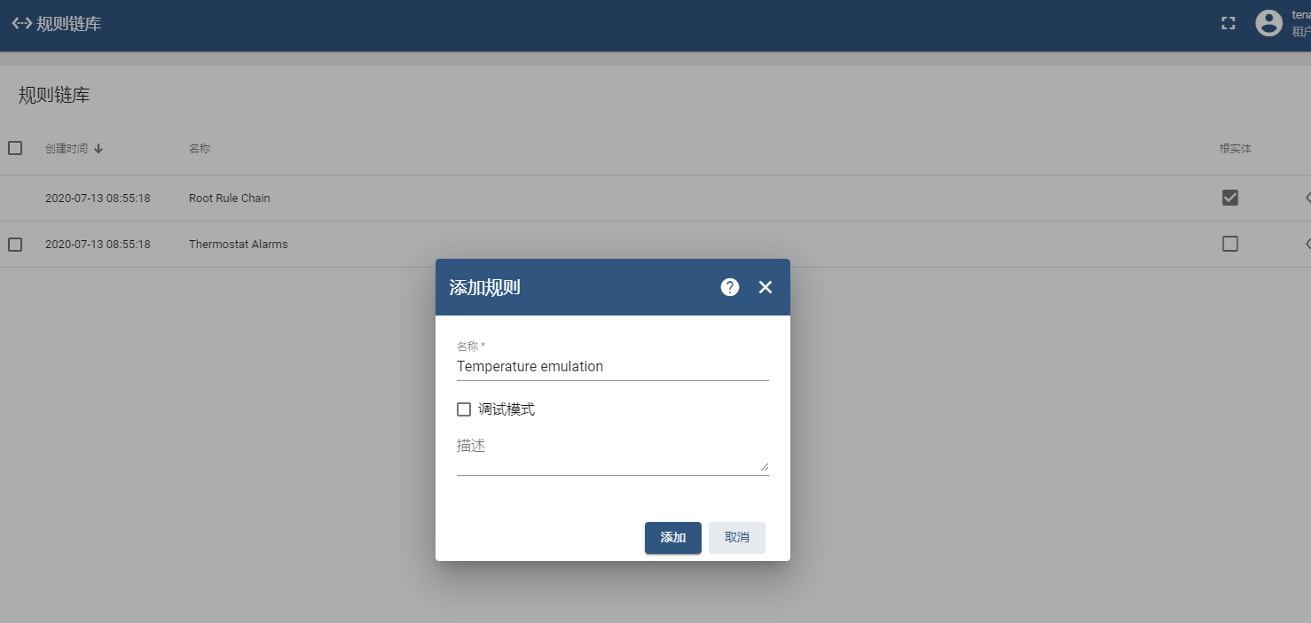 使用规则链连续推送数据,在主页面点击左侧栏 规则链库 项,进入规则链管理页面,单击 添加规则 添加新规则,弹出添加规则页面填写属性值,名称为 Temperature emulation ;
