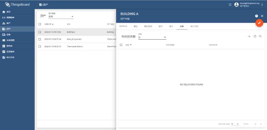创建完设备和资产后,需要定义资产和设置之间的关联关系。在 资产管理页面 单击上述创建的 Building A 资产 ,弹出资产详情页面,切换到 关联 tab页;点击 添加 按钮,进入 添加关联 页面,关联类型为 Contains 实体类型为 设备,选择刚刚创建的设备 Thermometer A-1 、 Thermometer A-2 分别添加;