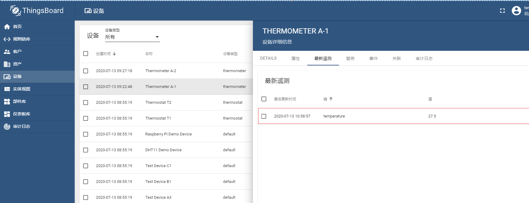添加完成后点击 应用更改 ,在设备 Thermometer A-1 最新遥测 tab页面即可看到实时变化的温度数据;