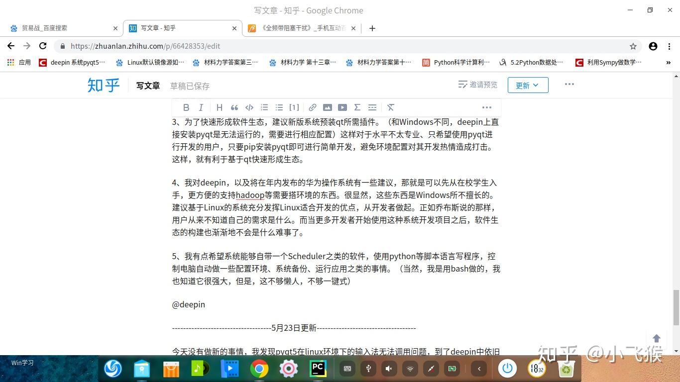今天没有做新的事情,我发现pyqt5在linux环境下的输入法无法调用问题,到了deepin中依旧存在,导致我的文本框只能输入英文。不过这是小问题,我自己用英文输入问题也不大。