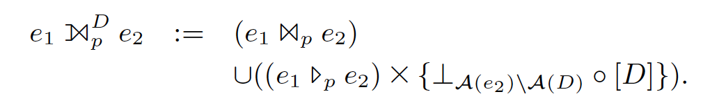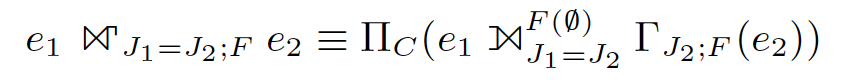 以上公式中,D = d1 : c1; ... dk : ck,表示在di这些列上,设置默认的填充值为ci。这对于后面groupjoin的等价转换时有意义。