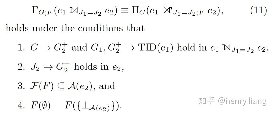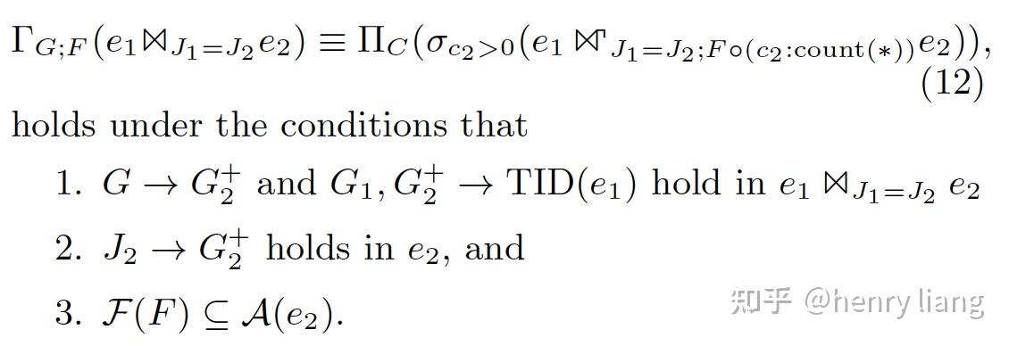 - condition 1意味着一个分组G只对应e1表的一行数据,不会有e1的两行数据属于同一个分组。这和前面讨论的,对e1的每一行,join的结果形成一个分组的结论一致。此外 G \rightarrow G_{2}^{+} 的意思是, G_{2}^{+} 相对于G来说并不是一个更细粒度的分组!如果是更细的分组,会导致G的一组数据,可能包含多个G2 + J2值对应的分组,因此一次join结果是不完全的。