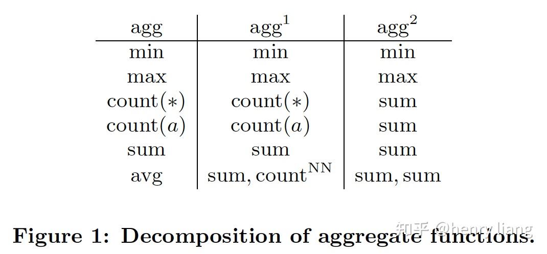 上图是SQL中最常见的decomposable聚集函数,其中 count^{NN} 是对non-null值的计数。