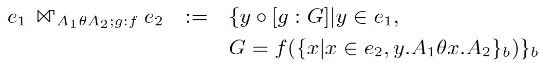 两个表e1/e2执行join A_{1} \theta A_{2} ,对于外表e1的一行数据y,内表e2所有可以与其join上的行集合{x},形成一个bag (multiset) ,对这个bag应用函数f后得到的一个标量结果并append到y后面,构成了新的属性列g。而这一组数据,就 完整的对应了实际的一个分组数据! 这样当join结束时,所有分组的计算都完成了。