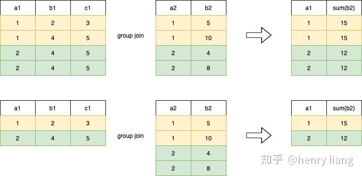 例如上图中,第一个groupjoin,由于左表有重复值,最终结果中也按照a1存在重复值,不是最终结果(如果要得到最终聚集结果,需要二次聚集)。而第二个groupjoin,左表没有重复值,因此可以得到正确结果。
