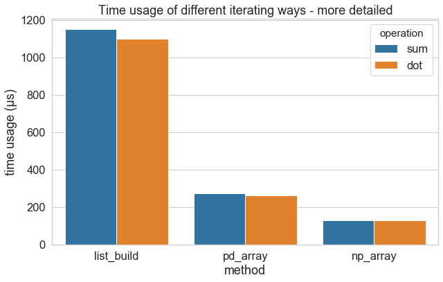 列表构造的运行速度是毫秒级的,数组操作是微秒级,np数组操作是pd数组操作的两倍。