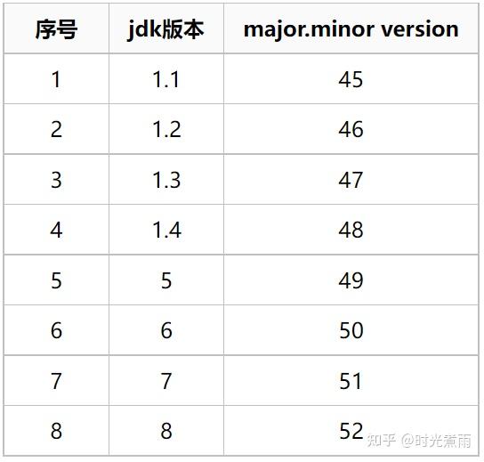 将上面二进制class文件转换为十六进制后,就可以看到,前四个字节就是固定值0xCAFEBABE,代表副版本号的第5/6个字节是0x0000,代表主版本号的第7/8个字节就是0x0034,也就是十进制的52,根据jdk版本对照表,可以看到我用的是java 8版本。