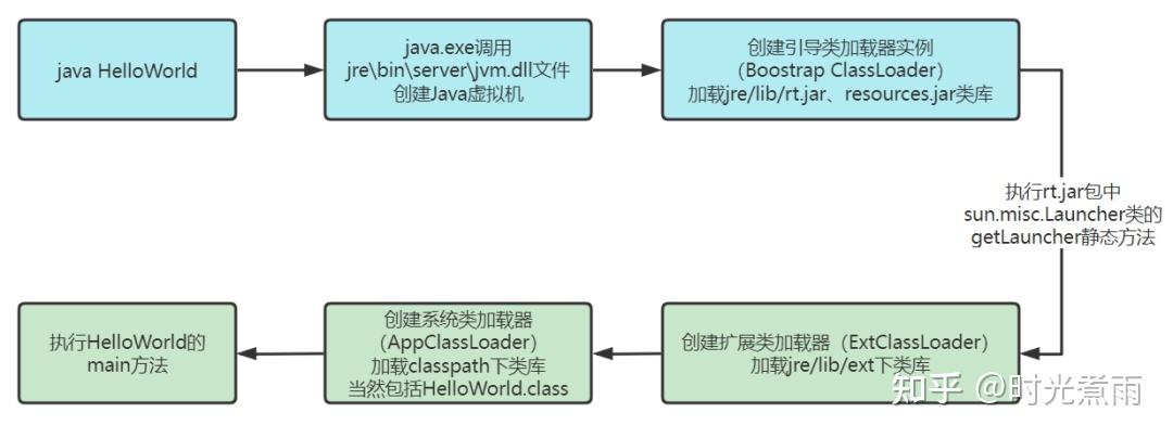 java HelloWorld 命令,就意味着使用java.exe启动JVM(Java虚拟机)解析执行我们的字节码文件(即HelloWorld.class),具体流程如下: