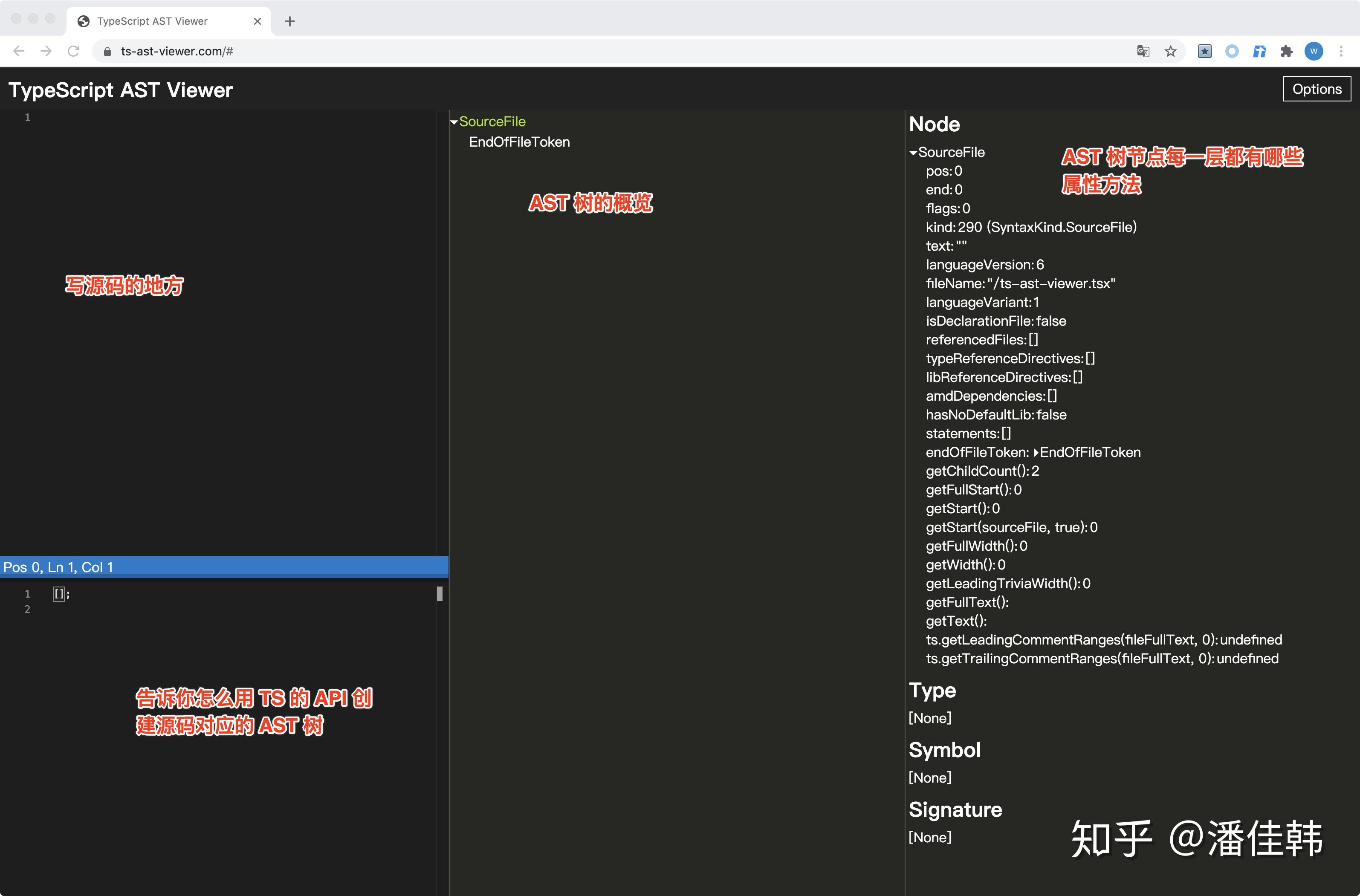 一开始我都是傻傻地用第一节那段代码打印 AST 树,直到我找到下面的网站: https:// ts-ast-viewer.com/ #