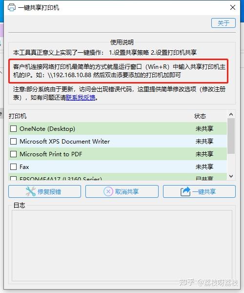 下载以后都不用安装,直接打开就能用,选择需要共享的打印机,再点一键共享一般就OK了。我的没出现报错的情况,著作说如果报错就点一下修复。