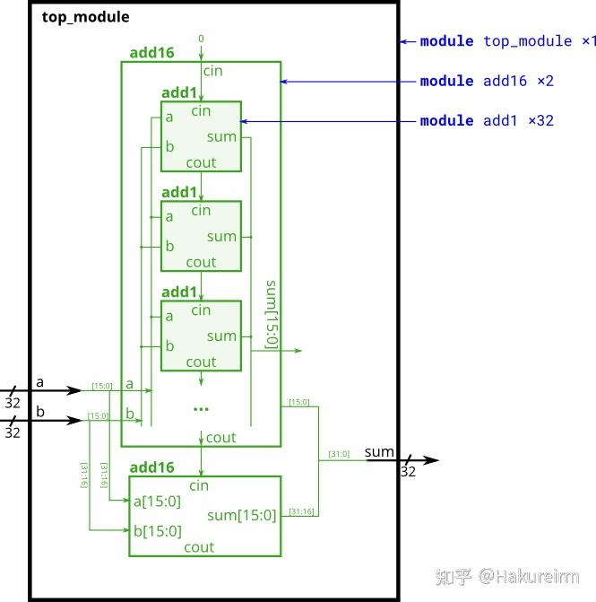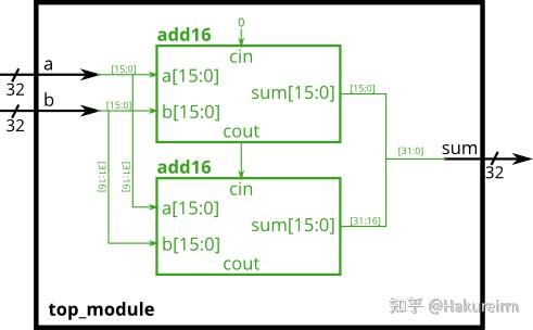 题目描述 在此练习中,用户需要创建一个包含两层调用的电路,在顶层模块中,实例化两个16bit位宽的加法器add16,而add16模块又是通过例化16个1bit全加器实现的,如下图所示: