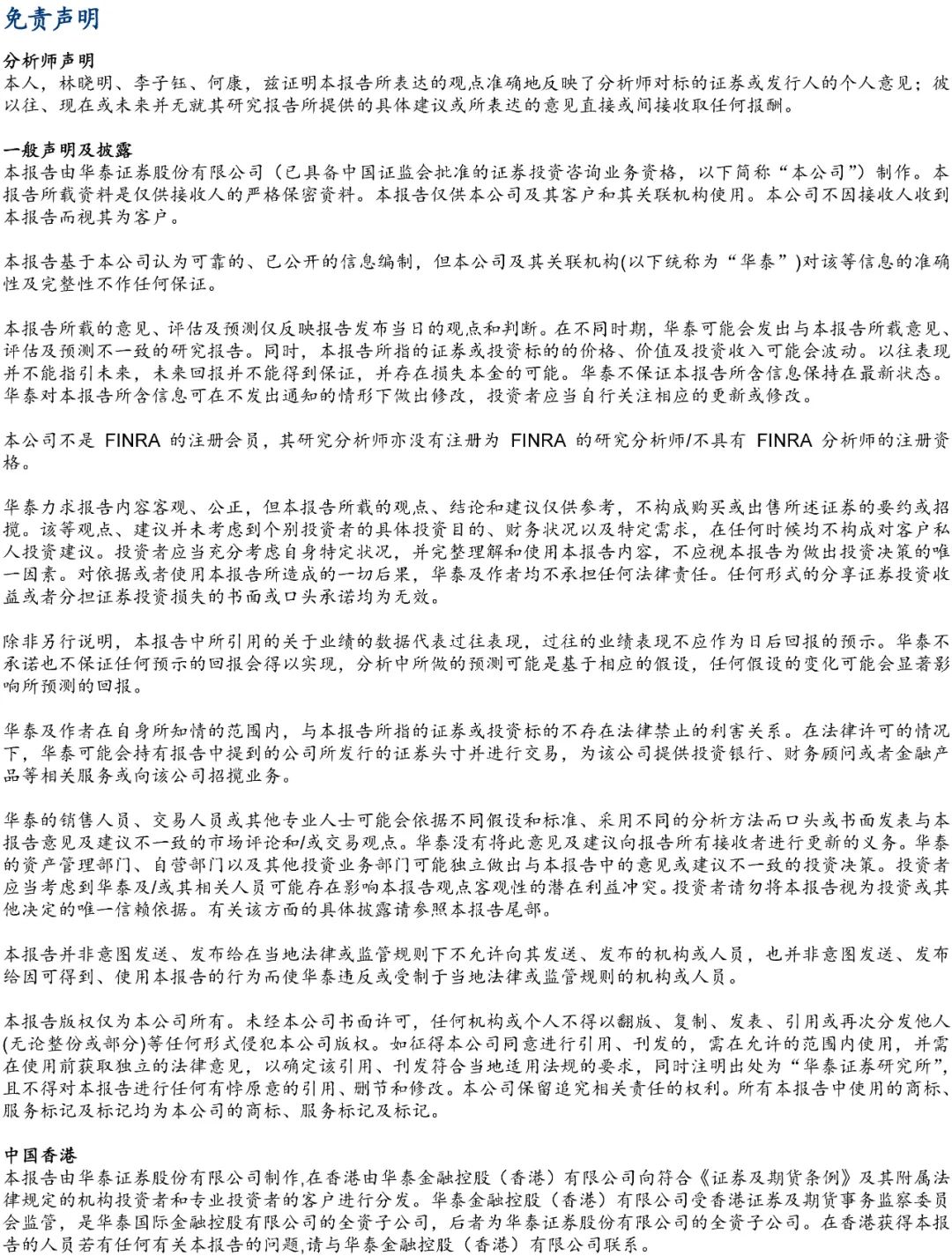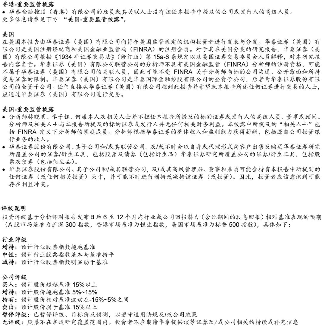在任何情况下,本公众号中的信息或所表述的意见均不构成对客户私人投资建议。订阅人不应单独依靠本订阅号中的信息而取代自身独立的判断,应自主做出投资决策并自行承担投资风险。普通投资者若使用本资料,有可能会因缺乏解读服务而对内容产生理解上的歧义,进而造成投资损失。对依据或者使用本公众号内容所造成的一切后果,华泰证券及作者均不承担任何法律责任。