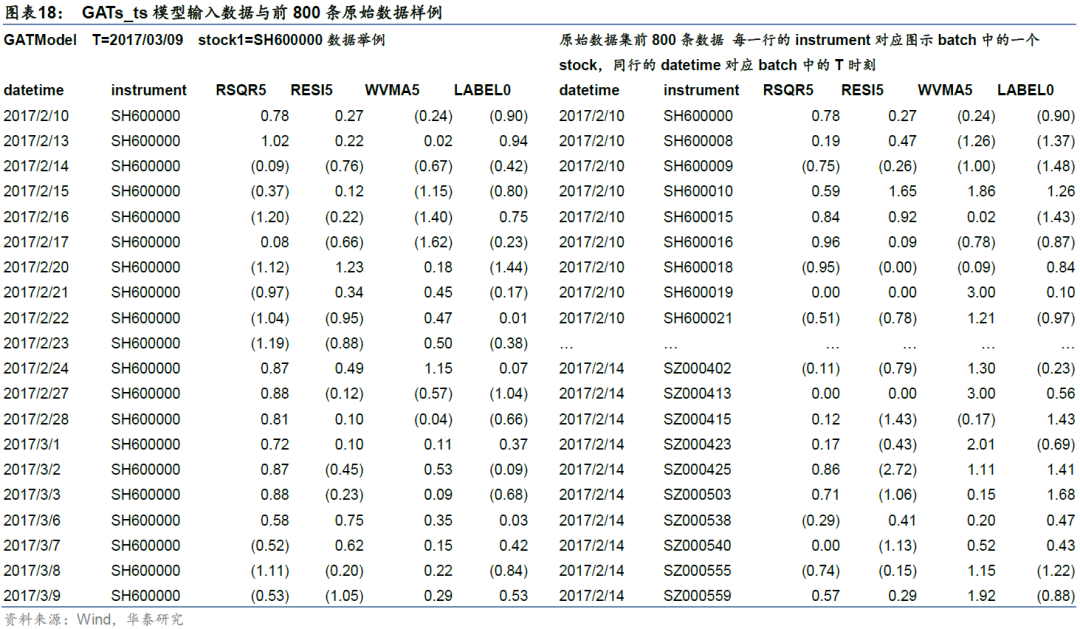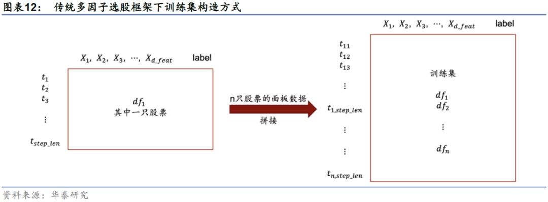 传统多因子选股框架中,股票数据属于面板数据,对单只股票而言,包含时间序列信息和一系列因子特征信息。传统的数据处理方法是将各时间截面上的各股票样本简单拼接起来组成训练集(如图12),送入全连接网络或循环神经网络,尽管数据量可以很大,但并没有挖掘出足够多的信息。这种数据处理方法忽略了面板数据所能提供的额外信息,比如时间域上的价格的自相关性和传递性,以及空间域上股票之间的相关性。