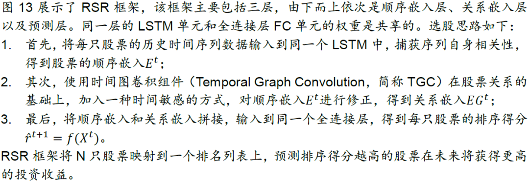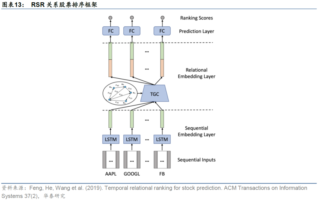 关系股票排序框架(Relational Stock Ranking,简称RSR)利用LSTM处理时间序列的优势和图神经网络GNN在空间域的优势,解决股票收益率的排序预测问题(Feng et al.,2019)。作为一种图时空网络模型,它为人工智能在选股上的应用提供了新的思路。