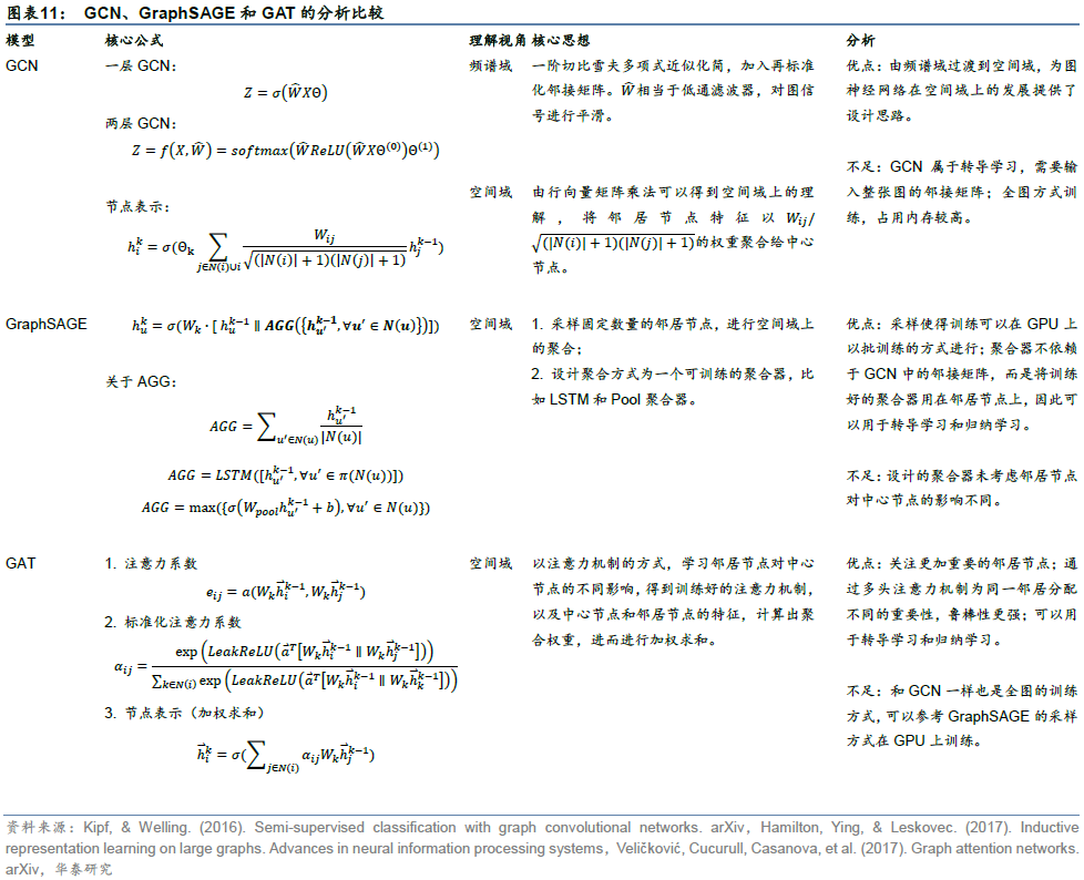 图神经网络(GNN)将深度学习技术的使用场景从传统的图像、语音拓展至图结构数据,在欺诈检测、购物推荐等领域有广泛应用。GNN由图信号理论和谱域图卷积发展而来,其思想是对样本间关系进行显式或隐式建图,每个节点对应一条样本,再将邻居节点的特征聚合到中心节点,以更新节点特征。图卷积网络(GCN)、GraphSAGE、图注意力网络(GAT)是三种具有代表性的GNN。GCN属于转导学习,当新样本加入时需重新训练模型方能进行预测;GraphSAGE和GAT分别通过聚合器和注意力机制的方式实现归纳学习,可直接用于新样本预测,适用于样本动态变化的股票市场。