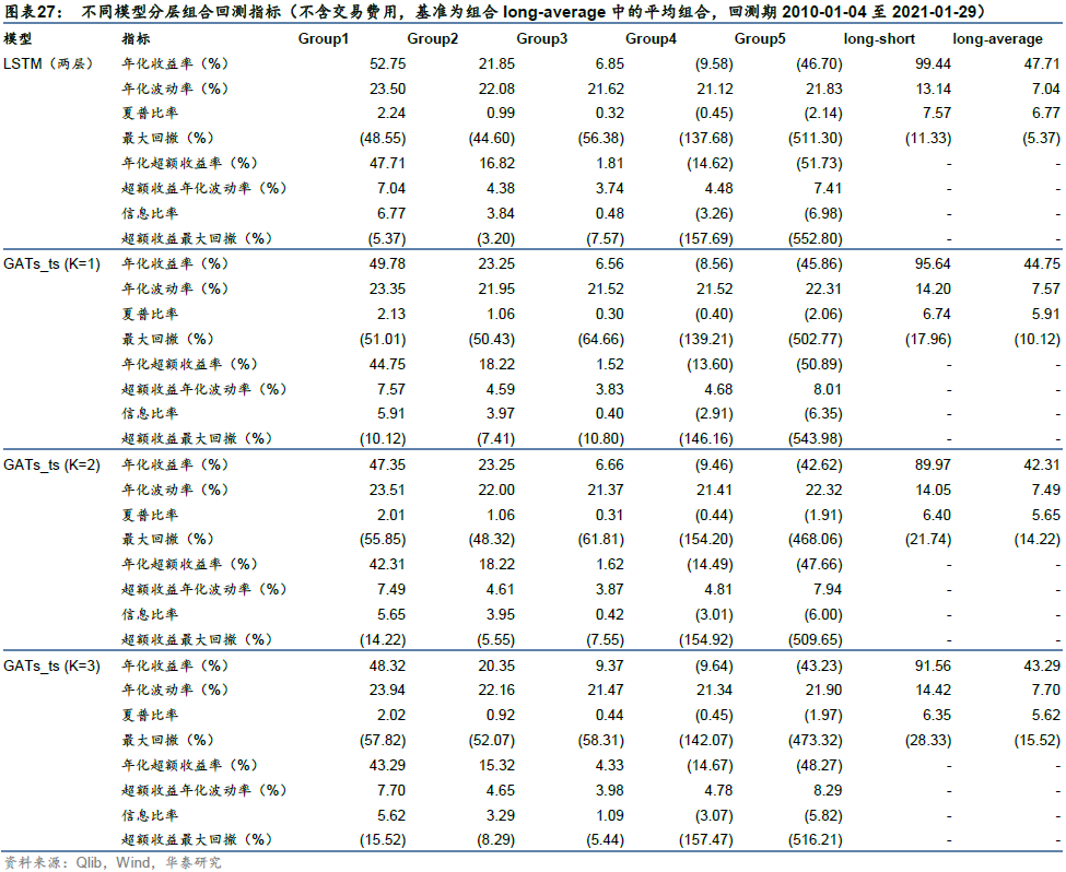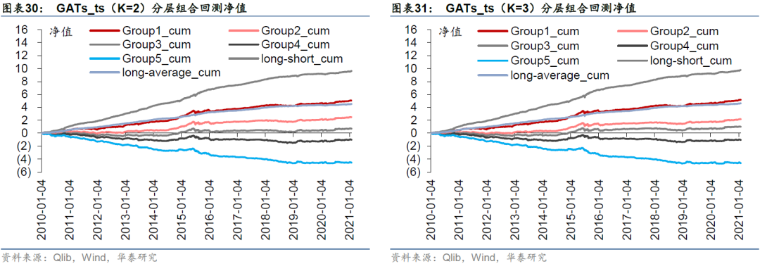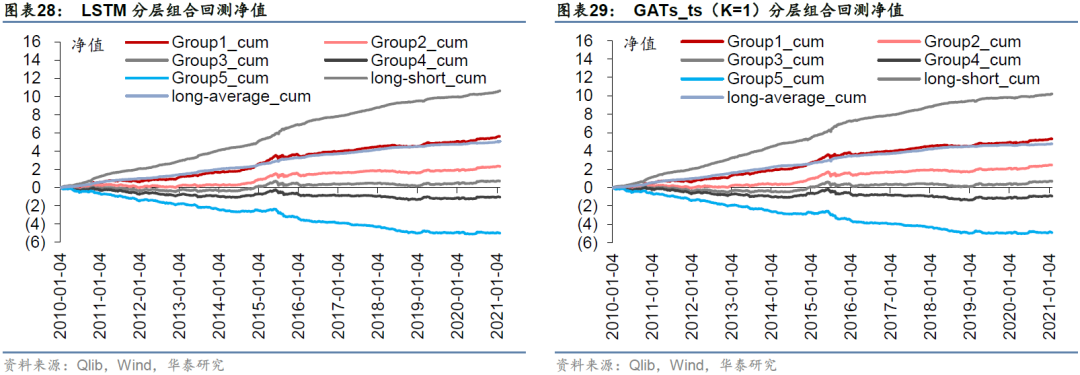一层GATs_ts在单因子测试上稍弱于LSTM,但在TopkDropout策略回测表现上优于LSTM,我们认为这可能是因为GATs_ts对整个股票池的预测能力稍逊,但对头部股票的预测能力较好。TopkDropout策略仅关注每个交易日预测得分最高的5只股票,即使对整个沪深300股票池预测能力一般,只要每日头部股票预测正确,仍能取得较高回测收益。