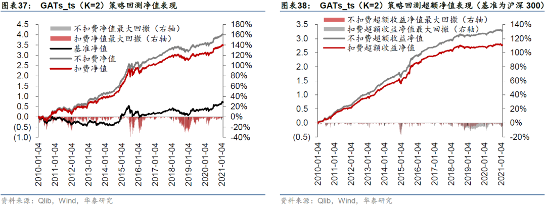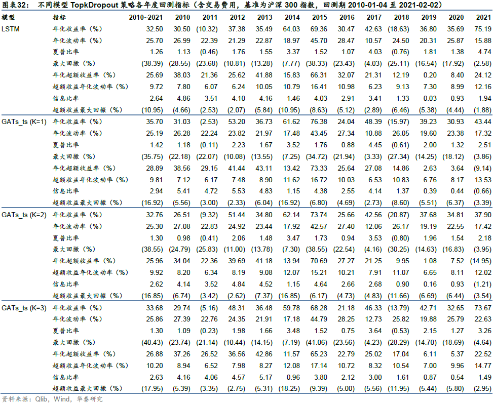 最后我们给出Qlib平台GATs_ts模型的实现方式,GATs_ts将GAT的注意力机制融入图时空网络选股框架。基于Qlib内置的Alpha158因子库,我们采用GATs_ts模型对沪深300成分股进行日收益率预测,随后构建日频调仓投资组合。回测期内(2010-01-04至2021-02-02),一层GATs_ts策略相对于基准沪深300指数的年化超额收益率为28.89%,信息比率为2.94,超额收益最大回撤为-16.92%,表现优于基准模型LSTM和多层GATs_ts。