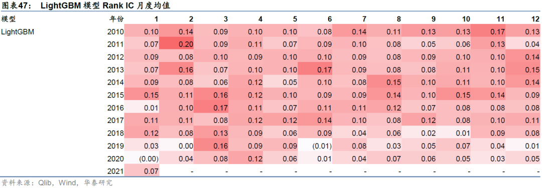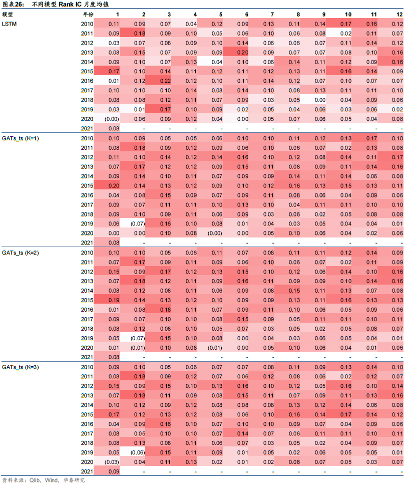 统计因子在各月上的表现,得到Rank IC月度均值,如表26所示。可以看到各模型月度Rank IC在2017年及以前相对稳定,在2018年及以后逐渐降低。这可能说明随着交易拥挤或者市场环境的变化,量价因子预测能力在逐渐失效。