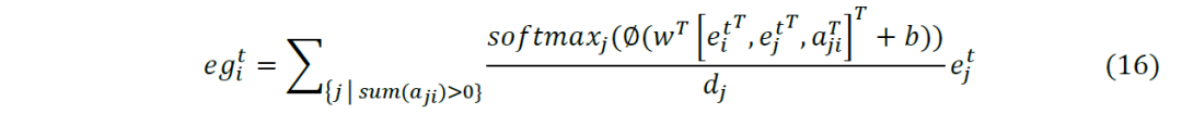 我们将式(15)得到的强度通过softmax函数标准化使邻居间可比,代入式(14)得到如下关系嵌入: