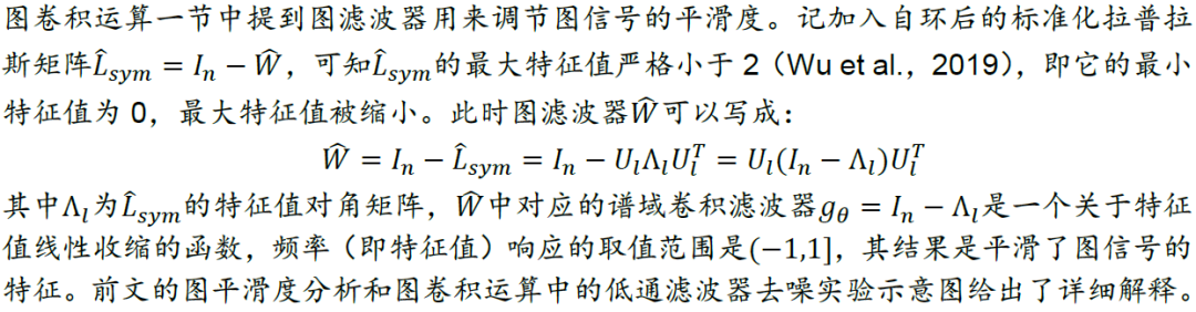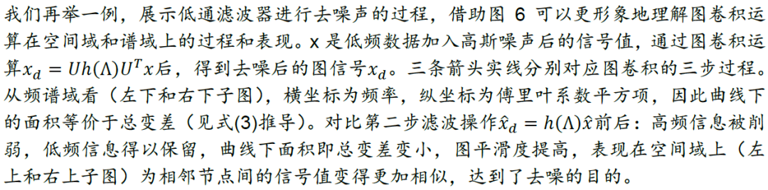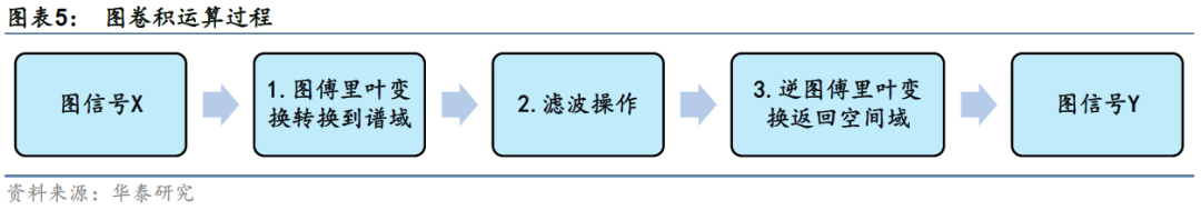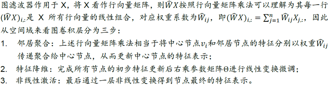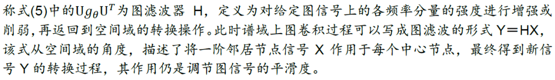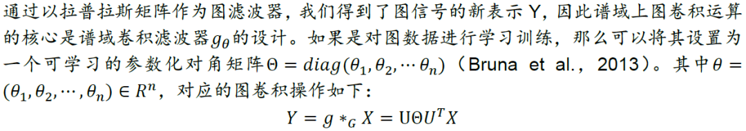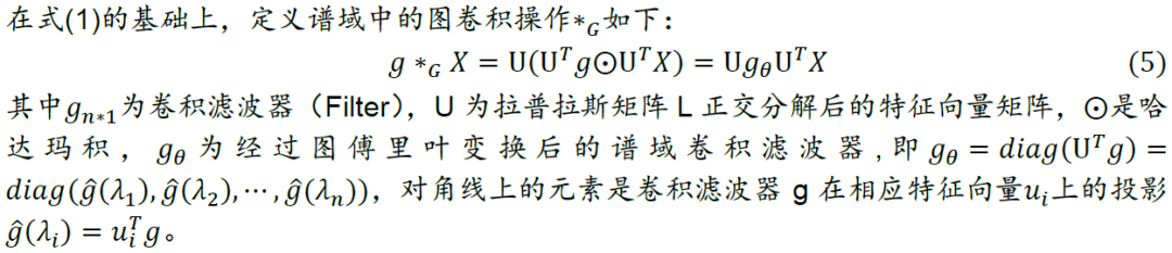 有了拉普拉斯矩阵和图傅里叶变换的定义后,我们对图信号先转换到谱域,对其在谱域上进行滤波操作,提取滤波器想要提取的特征,再对两者在谱域上的乘积做逆图傅里叶变换,得到空间域上新的图信号。由于滤波操作相当于卷积,因此上述运算也称为图卷积运算。