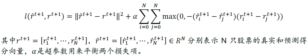 RSR框架最后将顺序嵌入层和关系嵌入层的结果进行拼接,输入到一个全连接层,以预测各股票收益率的排名得分,根据预测得分构建投资组合。为了优化模型,作者提出了一个点对回归损失和成对排序损失加和的目标函数: