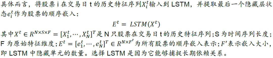 股票数据蕴含丰富的时间信息,股票的历史状况可能是影响其未来走势的最具影响力的因素之一。顺序嵌入层将每只股票的历史特征时间序列数据输入到LSTM,以捕获序列相关性,最终学习到股票的顺序嵌入。