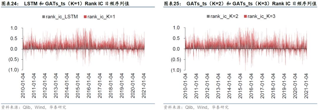 分年度和完整回测区间的汇总结果如表23,Rank IC日频序列值如图24和25所示。基准模型LSTM在回测期间的Rank IC均值和Rank ICIR分别为0.09和0.65,Rank IC值大于0的交易日占比为75.65%。对于GATs_ts模型,当图注意力层数为一层(即K=1)时,2010~2021年的Rank IC均值和Rank ICIR分别为0.09和0.63,Rank IC值大于0的交易日占比为74.76%。总的来看,LSTM模型的IC测试结果略优于GATs_ts模型,一层GATs_ts模型优于其它层数(K=2或3)的GATs_ts模型。