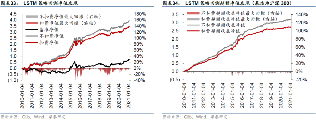 图33至图40分别展示四个模型在回测期间的净值和超额净值图。LSTM超额收益最大回撤发生在2014-11-24至2014-12-22,回撤幅度为-10.95%;GATs_ts(K=1)超额收益最大回撤发生在2014-11-24至2015-1-5,回撤幅度为-16.92%。GATs_ts控制风险能力略逊于LSTM。