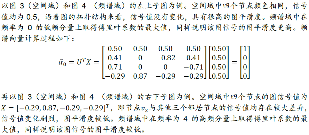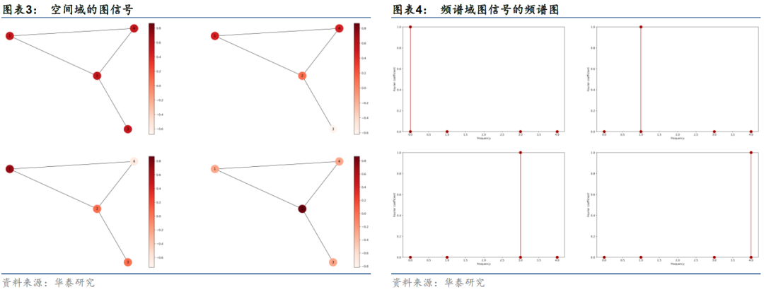 下面我们以更具体的例子展示图平滑度分析的过程。以图表1中G为例,我们分别设定四组不同的信号值,计算四种情况各自对应的图平滑度。每一种情况下,各节点的信号值以色阶形式展示在空间域上,如图3所示;按特征值从小到大的顺序,将图信号在该频率分量上的傅里叶系数即强度以柱图形式展示在频谱域上,如图4所示。