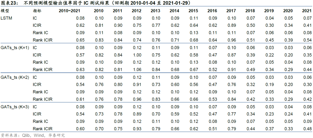 如果将模型的输出即预测收益率视为单因子,则可以对单因子向量与真实收益率向量进行IC值分析,得到不同预测模型在各年度IC均值、Rank IC均值、ICIR和Rank ICIR,衡量因子的有效性。预测模型包括1、2、3层GATs_ts以及基准模型LSTM。