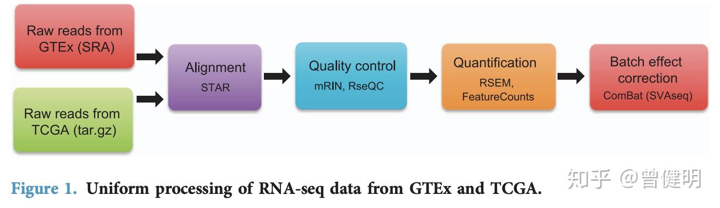 TCGA和GTEX是两个超级大的拥有RNA-seq数据的计划,其中TCGA涵盖33种癌症,超1万个样品,而GTEX也有500多个病人的50多种组织的近1万个样品数据。它们各自的发起单位对RNA-seq数据处理不一样,而且后续也有一些新的流程处理试图统一两个数据库的RNA-seq数据分析结果, 比较出名的5个流程分别是 :