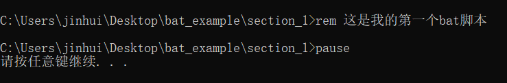 pause指令,从它英文含义就知道是暂停的意思。平常执行bat脚本的时候,如果不加pause指令时,我们执行bat脚本就会是一闪而过的出现控制台窗口,如果加了pause指令,就可以让我们控制台窗口停留,并且还会给出一段提示语“请按任意键继续”,也可以更改提示语