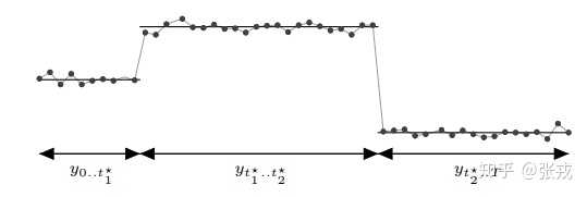 除此之外,在现实的时间序列中,曲线的走势肯定不会一直保持不变,在某些特定的时候或者有着某种潜在的周期曲线会发生变化,这种时候,就有学者会去研究变点检测,也就是所谓 change point detection。例如下面的这幅图的 t_{1}^{*}, t_{2}^{*} 就是时间序列的两个变点。