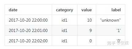 就一般情况而言,时间序列的离线存储格式为时间戳和值这种格式,更多的话可以提供时间序列的 ID,标签等内容。因此,离线存储的时间序列通常都是以下的形式。其中 date 指的是具体的时间戳,category 指的是某条特定的时间序列 id,value 指的是在 date 下这个 category 时间序列的取值,label 指的是人工标记的标签('0' 表示异常,'1‘ 表示正常,'unknown' 表示没有标记或者人工判断不清)。
