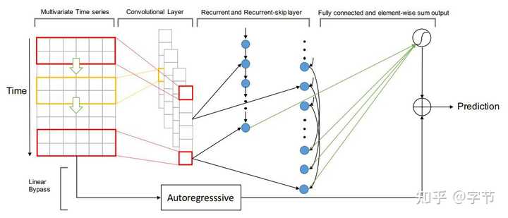 当年应该是在 Papers With Code 上看到 LSTNET 占据了几个 benchmark 的榜首位置,也去简单尝试了一下,模型结构也是愈发花里胡哨: