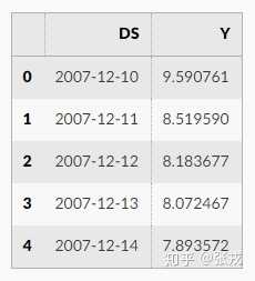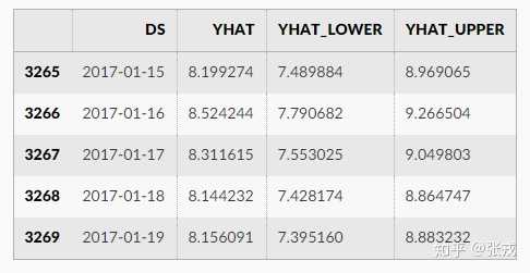 而 fbprophet 所需要的时间序列也是这种格式的,根据官网的描述,只要用 csv 文件存储两列即可,第一列的名字是 'ds', 第二列的名称是 'y'。第一列表示时间序列的时间戳,第二列表示时间序列的取值。通过 prophet 的计算,可以计算出 yhat,yhat_lower,yhat_upper,分别表示时间序列的预测值,预测值的下界,预测值的上界。两份表格如下面的两幅图表示。