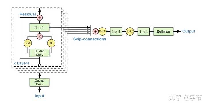 除了使用一维 CNN 来做序列预测外,WaveNet 里还加入了 residual connection 和 skip connection,以及一系列复杂的“门机制”: