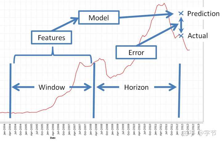 机器学习方法处理时序问题的基本思路跟前面提到的时序验证划分一致,就是把时序切分成一段历史训练窗口和未来的预测窗口,对于预测窗口中的每一条样本,基于训练窗口的信息来构建特征, 转化为一个表格类预测问题 来求解。
