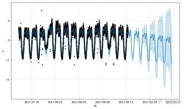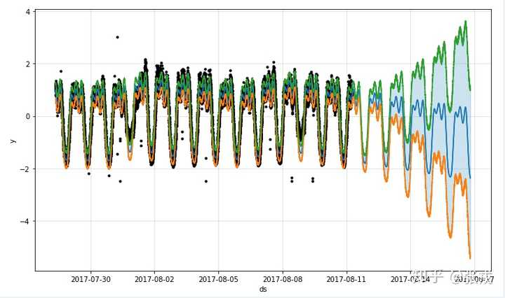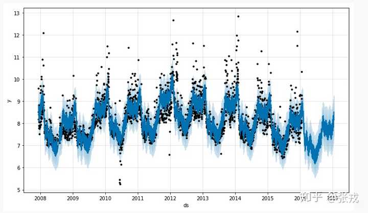 首先让我们来看一个常见的时间序列场景,黑色表示原始的时间序列离散点,深蓝色的线表示使用时间序列来拟合所得到的取值,而浅蓝色的线表示时间序列的一个置信区间,也就是所谓的合理的上界和下界。prophet 所做的事情就是:
