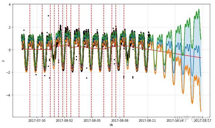 - Change Points:可以通过 n_changepoints 和 changepoint_range 来进行等距的变点设置,也可以通过人工设置的方式来指定时间序列的变点。