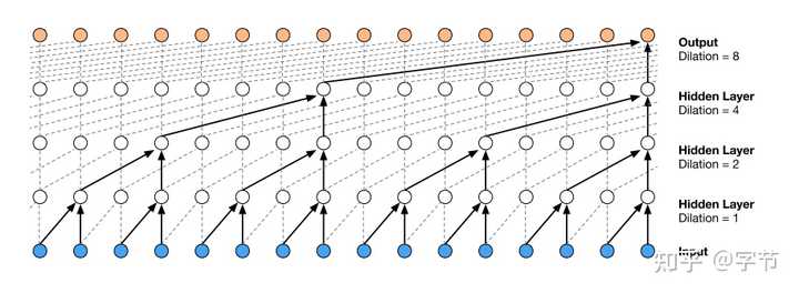 这也是当年非常火的一个模型,主要是 RNN 系列模型不好并行,所以突然发现谷歌提出的这个空洞因果卷积感觉很高级,性能理论上也比 RNN 之类的好很多,它的结构大致长这样:
